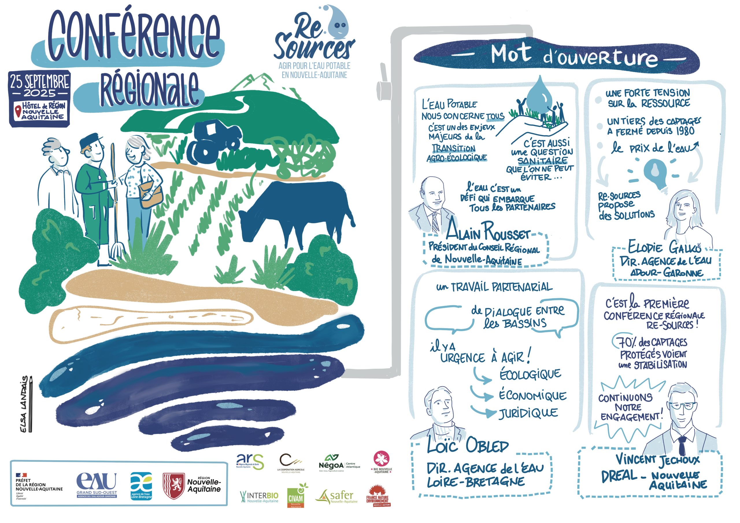 Le 25 septembre 2025, la première conférence régionale Re-Sources a réuni pour la première fois plus de 110 partenaires locaux et régionaux : collectivités eau, coopératives, négoces et partenaires agricoles, Région Nouvelle-Aquitaine, agences de l’eau, Etat.